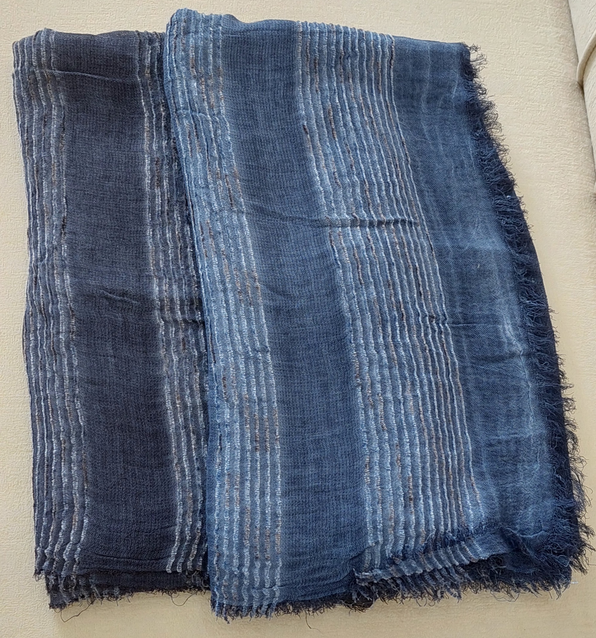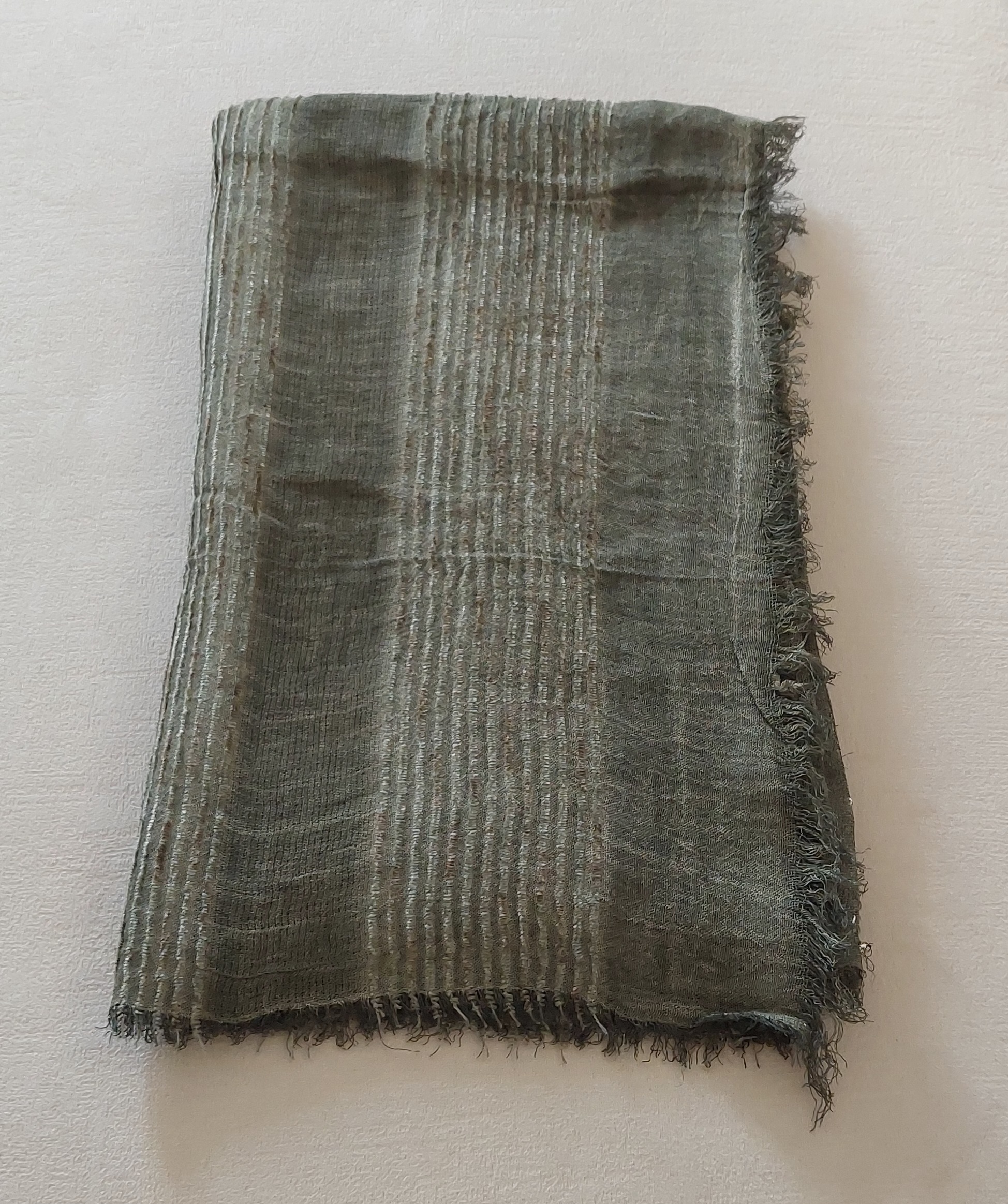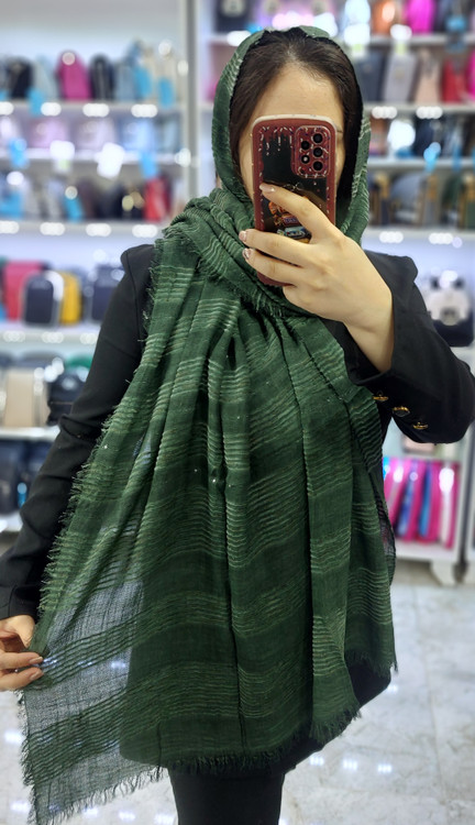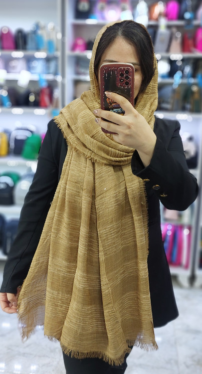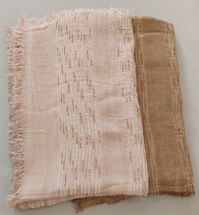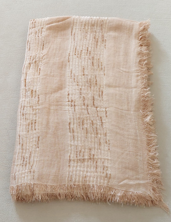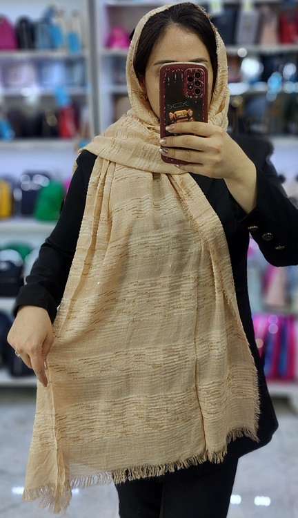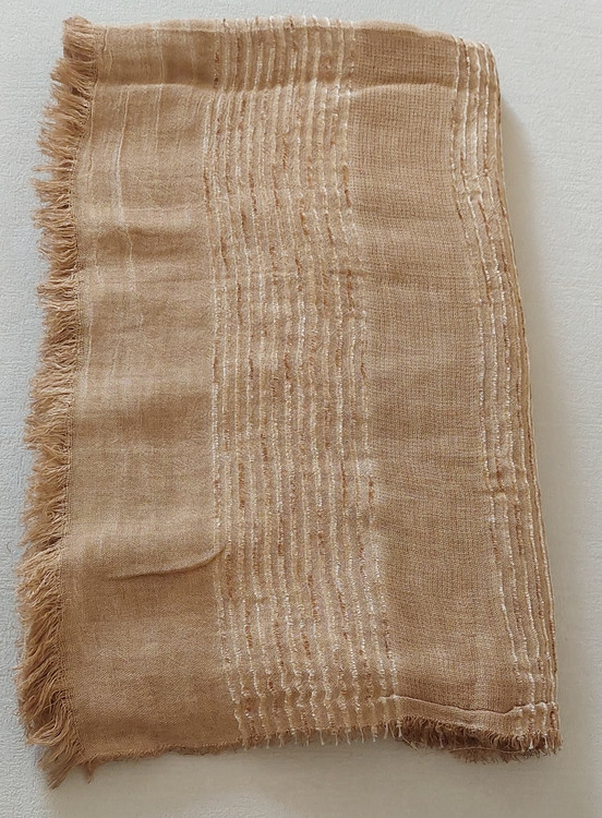 شال کنفی وارداتی دورو دور ریش وپولک دار وروی شال حالت خط های برجسته طرح دارد.