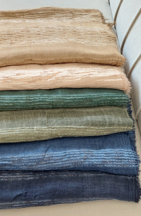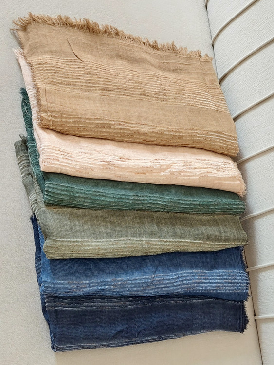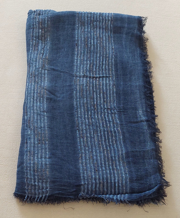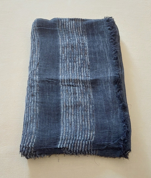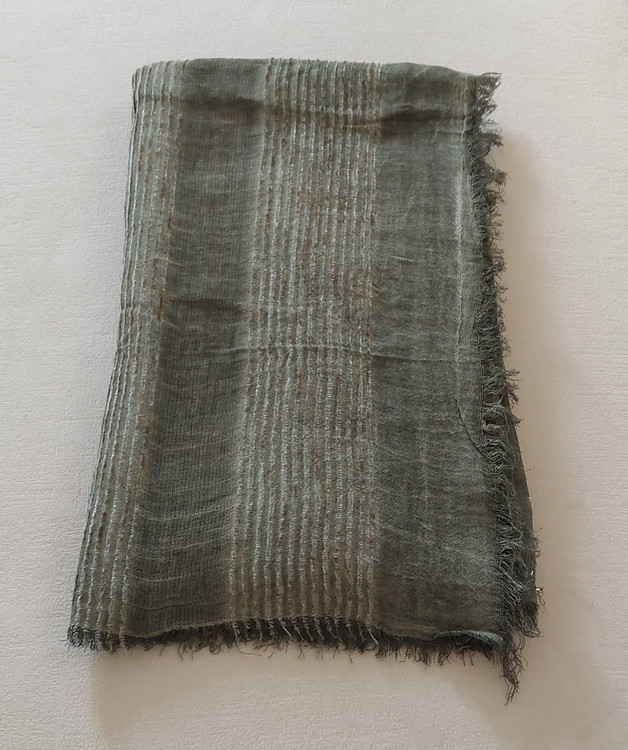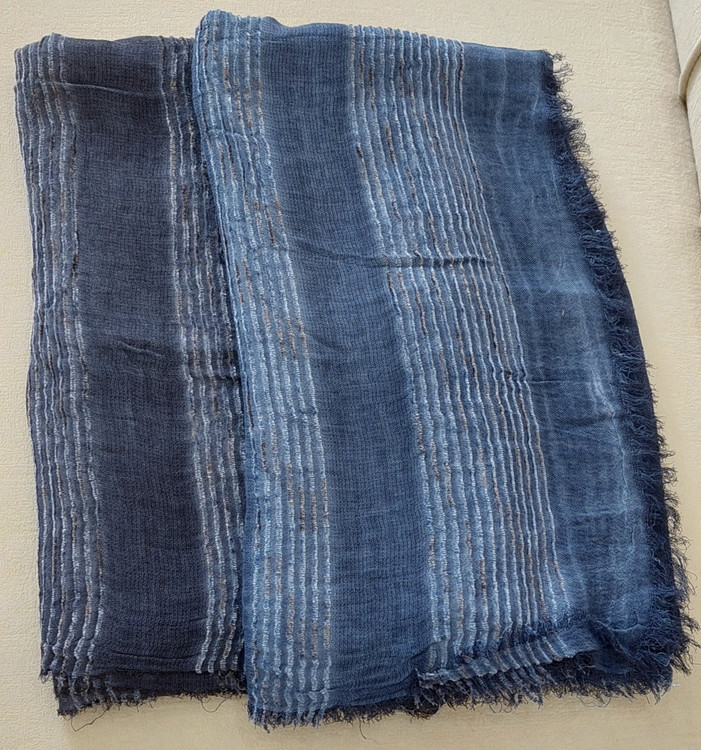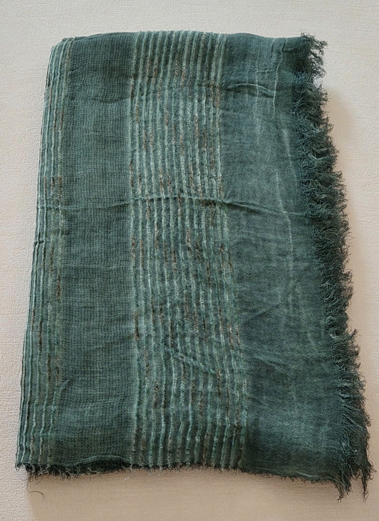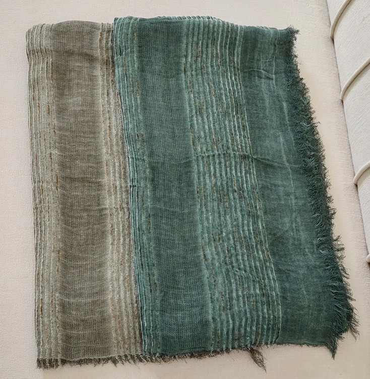 شال کنفی وارداتی دورو دور ریش وپولک دار وروی شال حالت خط های برجسته طرح دارد.