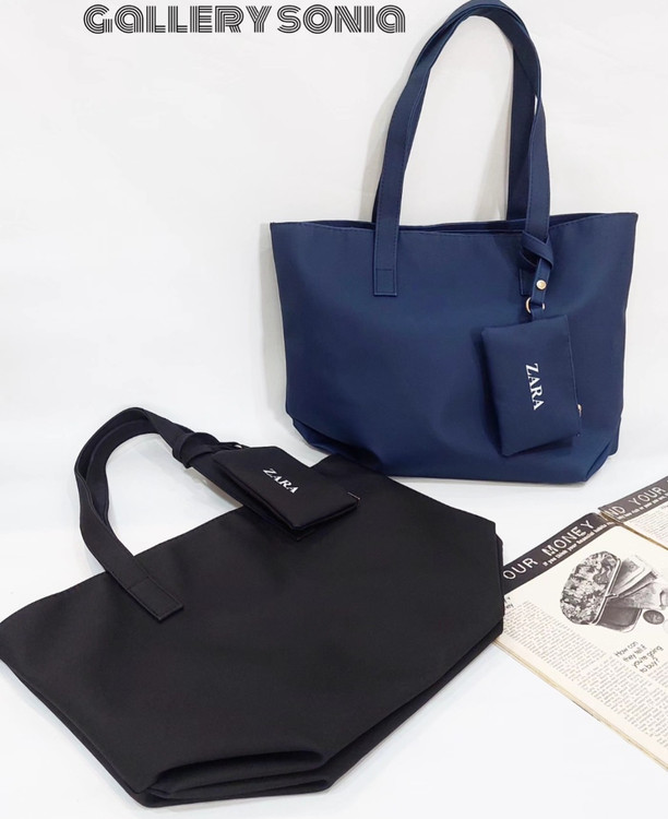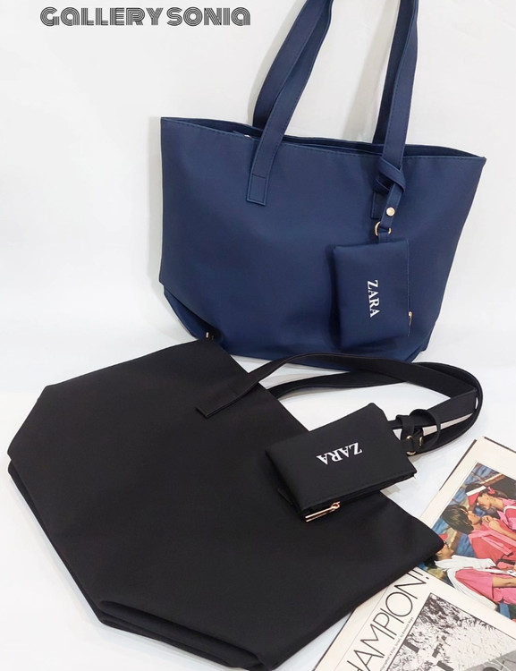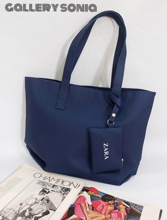 کیف متوسط طرح زارا رنگ سورمه ای جنس نانسی ضدنفوذ آب بسیار شیک وخوش دست که به بندش یککیف کوچیک کاربردی وصله برای نگهداری پول نقد،کلید یا کارتهای بانکی.