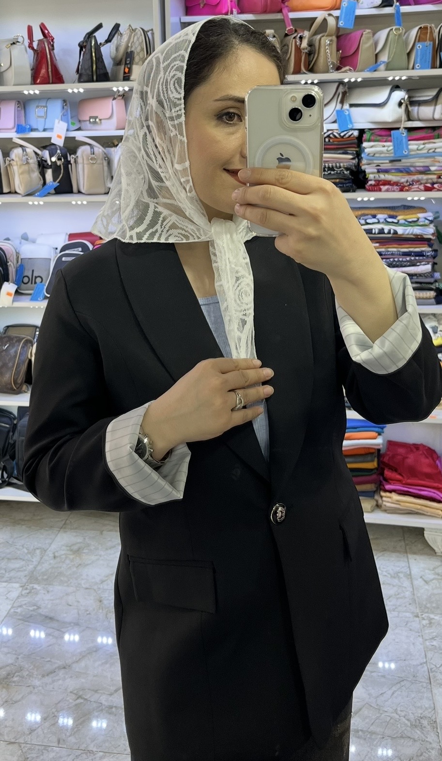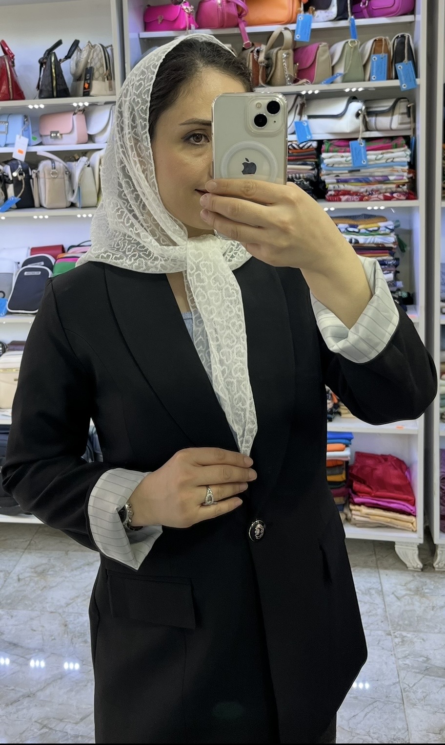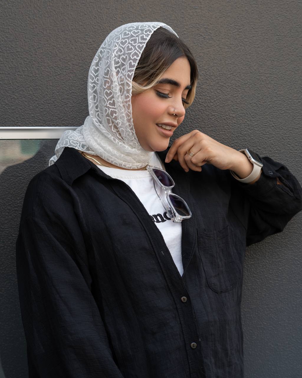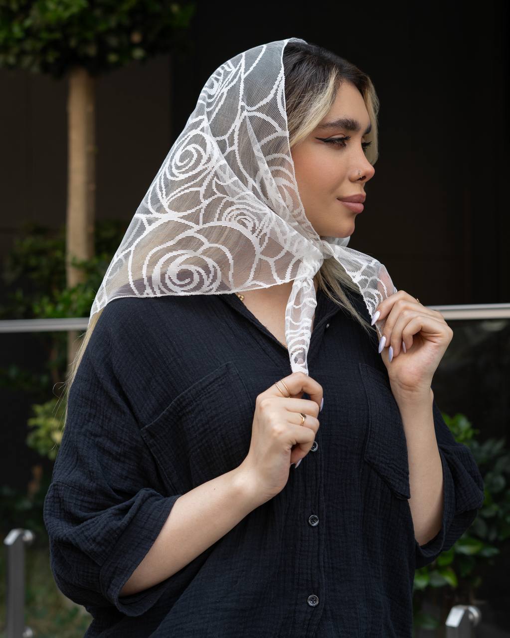 مینی اسکارف ترند تمام تور رنگ سفید شایندار با دوطرح گل درشت و قلبی ریز با انواع کت ها استایل میشه