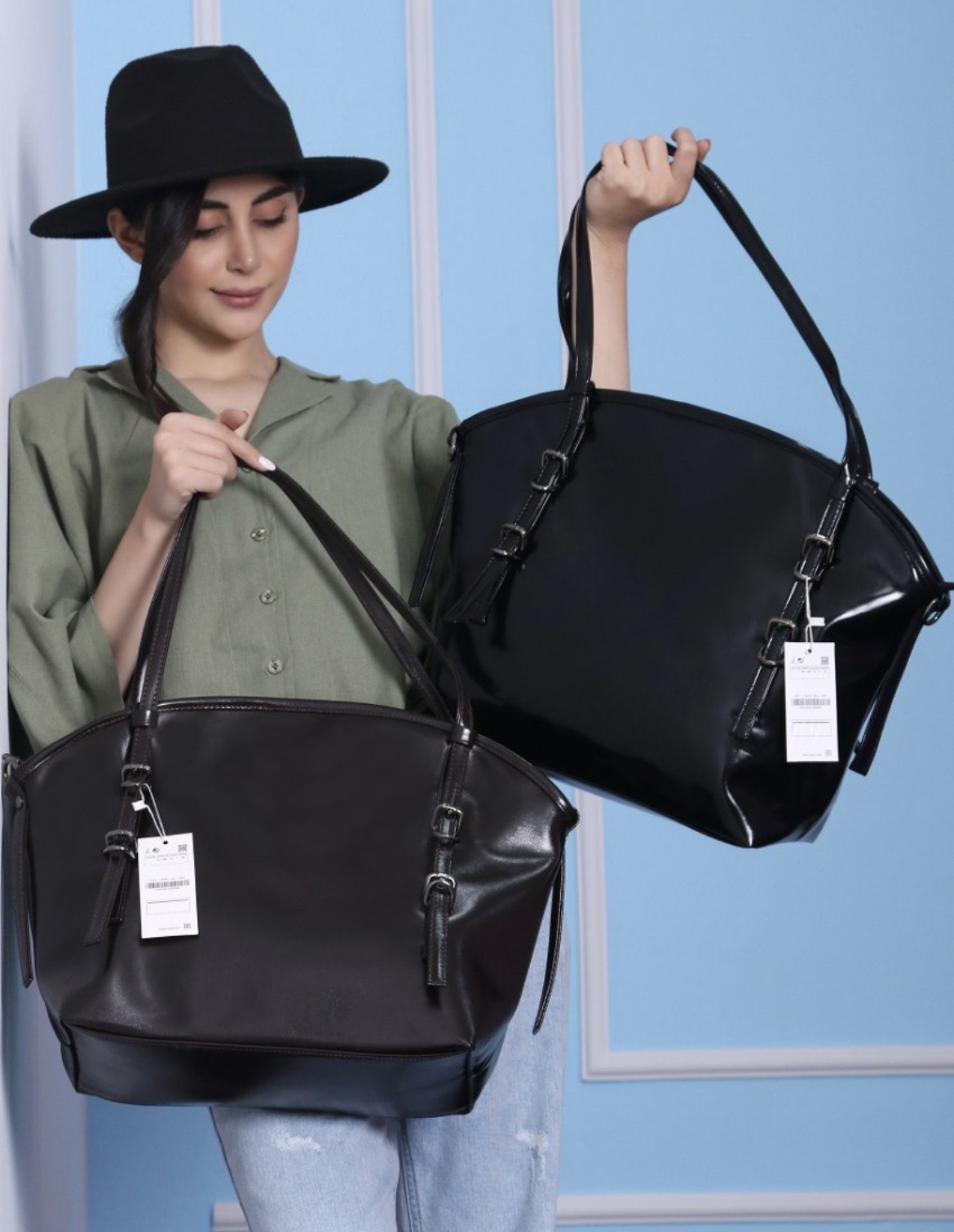 کیف سایز بزرگ طرح زارا کار پرفروش و پر طرفدار با بندهای سگک دار در دورنگ قهوه ای روشن وقهوه ای سوخته موجوده