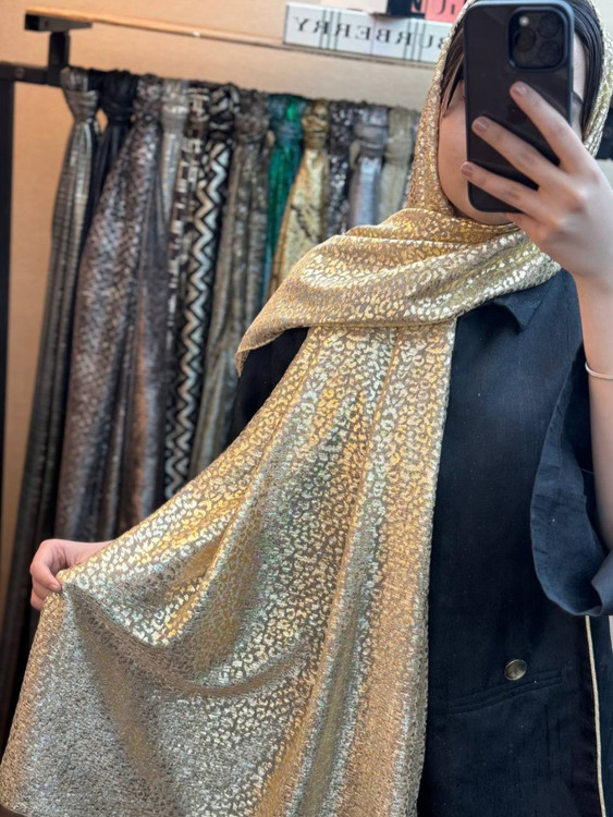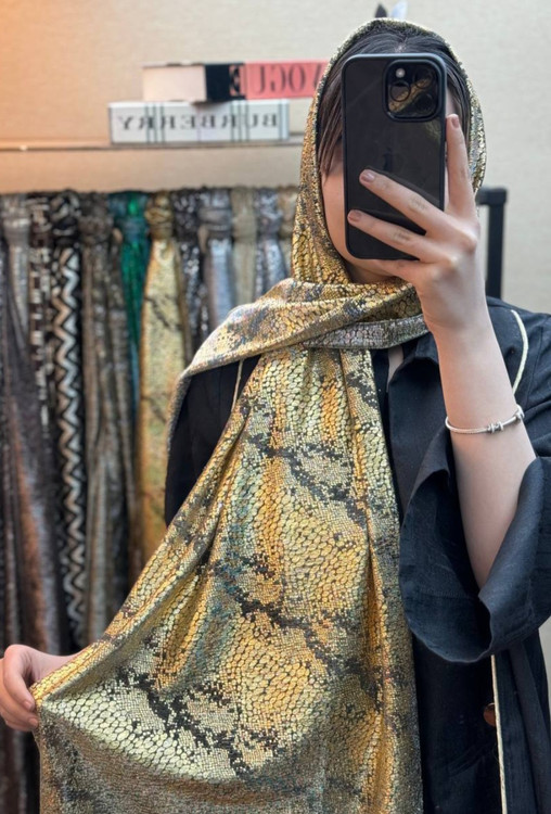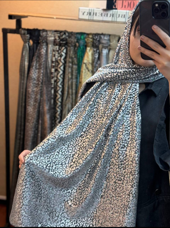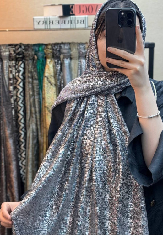 شال زیبای مجلسی که با طرحهای گل، پوست ماری و سنگی با حالت اکلیل های درشت طراحی شده است.