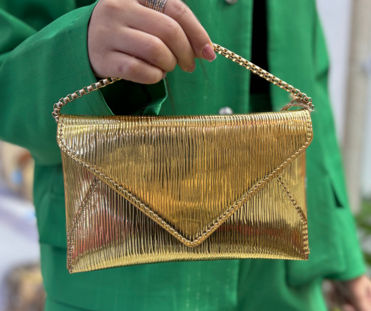 کیف پاکتی جنس ورنی رنگطلایی با بند زنجیر طلایی باکیفیت و رنگ ثابت