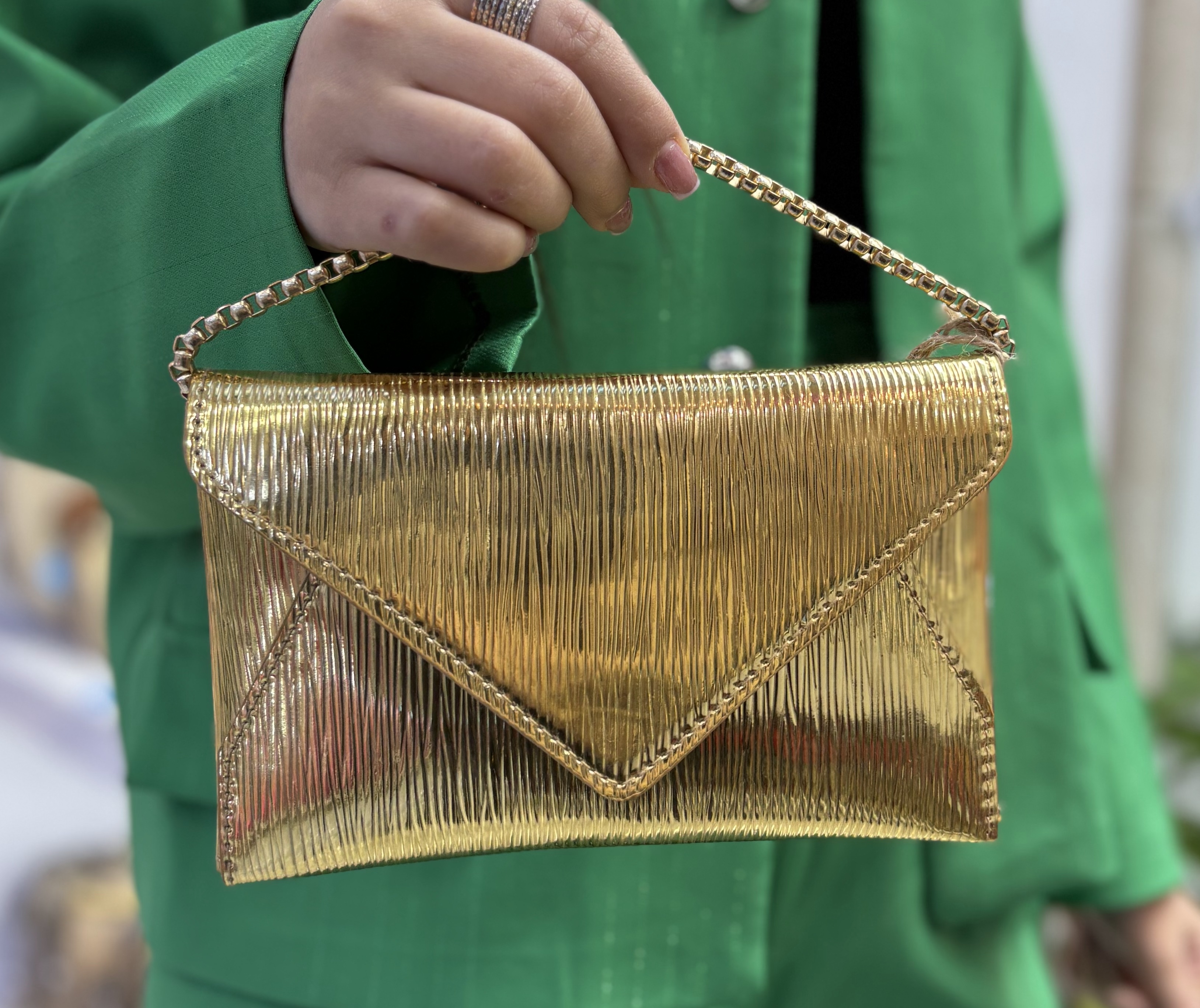 کیف پاکتی جنس ورنی رنگطلایی با بند زنجیر طلایی باکیفیت و رنگ ثابت