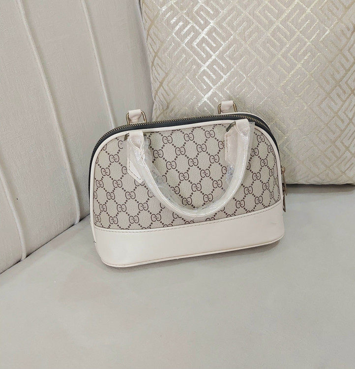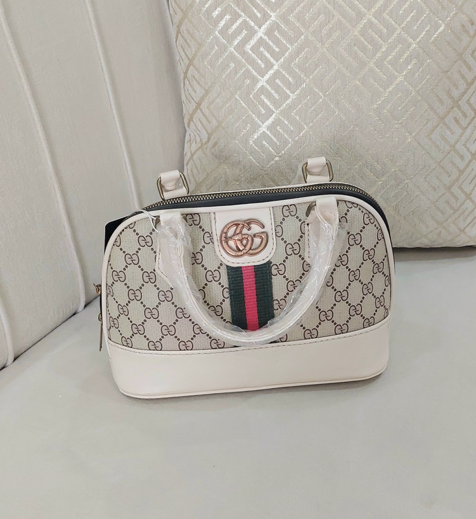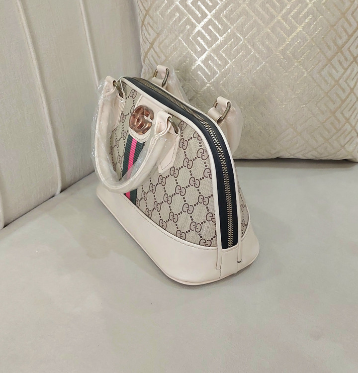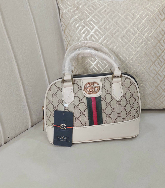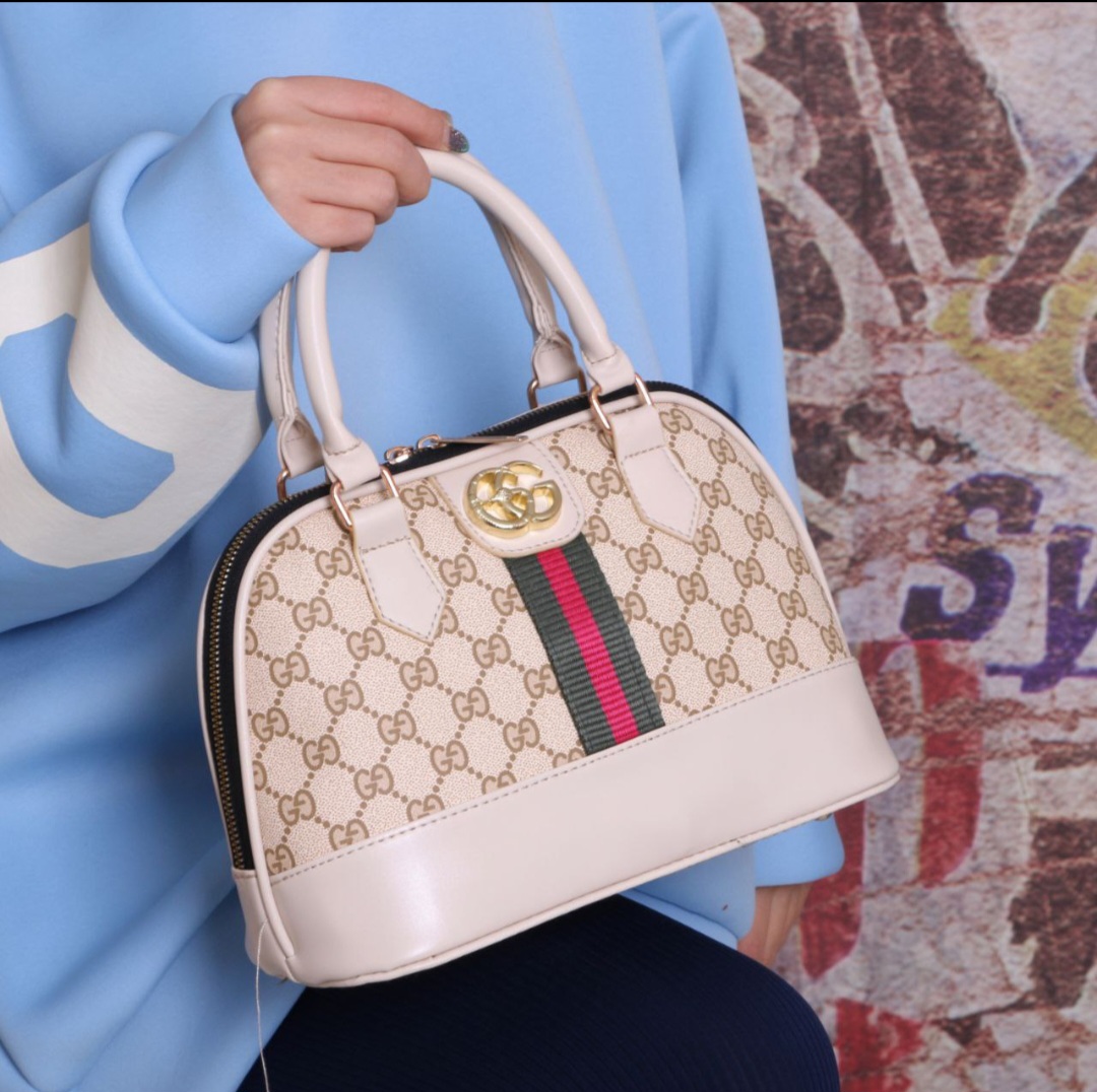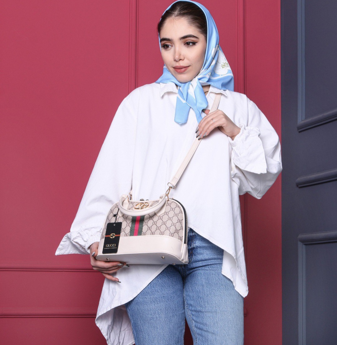کیف طرحدار با طرح زیبا وپرطرفدار گوچی دارای بند چرمی دسته کوتاه وبندچرمی کرم رنگ بلند