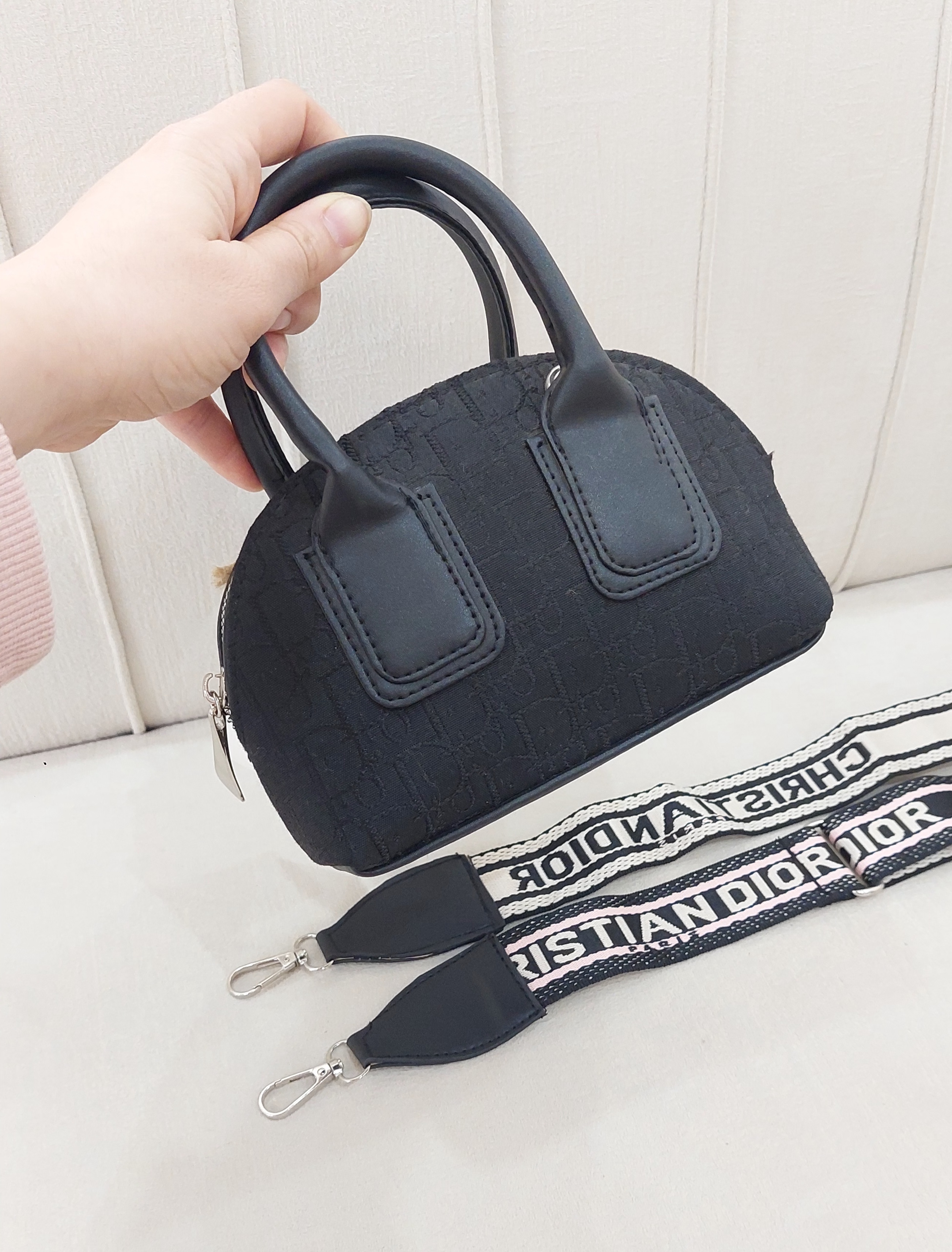 کیف پاسپورتی طرحدار دیور مدل نیم گرد که اسم دیور روی کل کیف حک شده است. علاوه بر دو بند کوتاه دستی دوطرف حلقه دارد که بند بلند برزنتی قابل تنطیم هم به کیف وصل میشود.